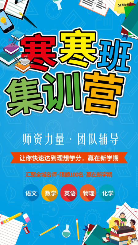 凡科快图提供卡通寒假集训营培训班手机海报在线设计,属于社交媒体下的手机海报模板,适合活动推广、产品促销、宣传等多个应用场景,教育培训/广告设计等行业通用,点击使用此模板可在线设计手机海报,模板中的文字和图片均可编辑,1分钟完成图片设计,一键免费下载高清手机海报。