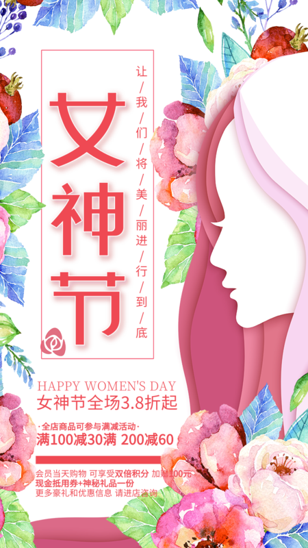 水彩风妇女节促销手机海报