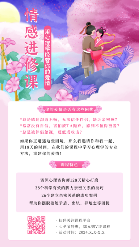 凡科快图提供手绘七夕课程活动促销手机海报在线设计,属于社交媒体下的手机海报模板,适合活动推广、产品促销、宣传等多个应用场景,教育培训等行业通用,点击使用此模板可在线设计手机海报,模板中的文字和图片均可编辑,1分钟完成图片设计,一键免费下载高清手机海报。