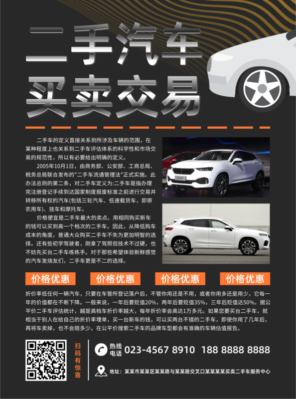 凡科快图提供黑色创意汽车买卖宣传单/DM宣传单在线设计,属于印刷物料下的DM宣传单模板,适合活动推广、产品促销、宣传等多个应用场景,汽车等行业通用,点击使用此模板可在线设计DM宣传单,模板中的文字和图片均可编辑,1分钟完成图片设计,一键免费下载高清DM宣传单。